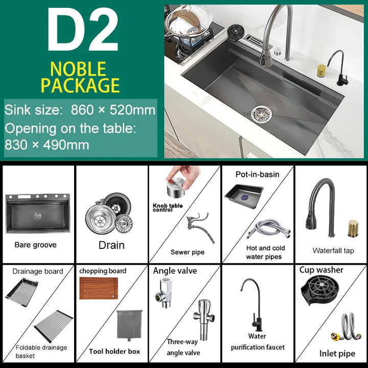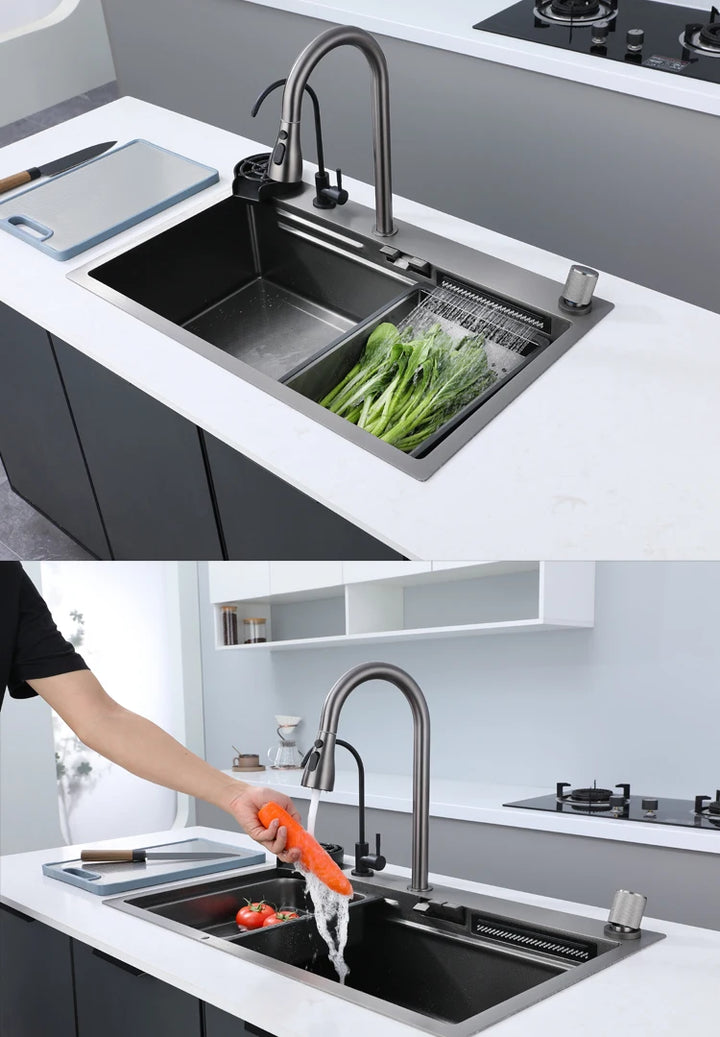 Kitchen Sink Stainless Steel With Waterfall Large Single Slot Multifunctional Dishwashing Sinks Undermount Basin