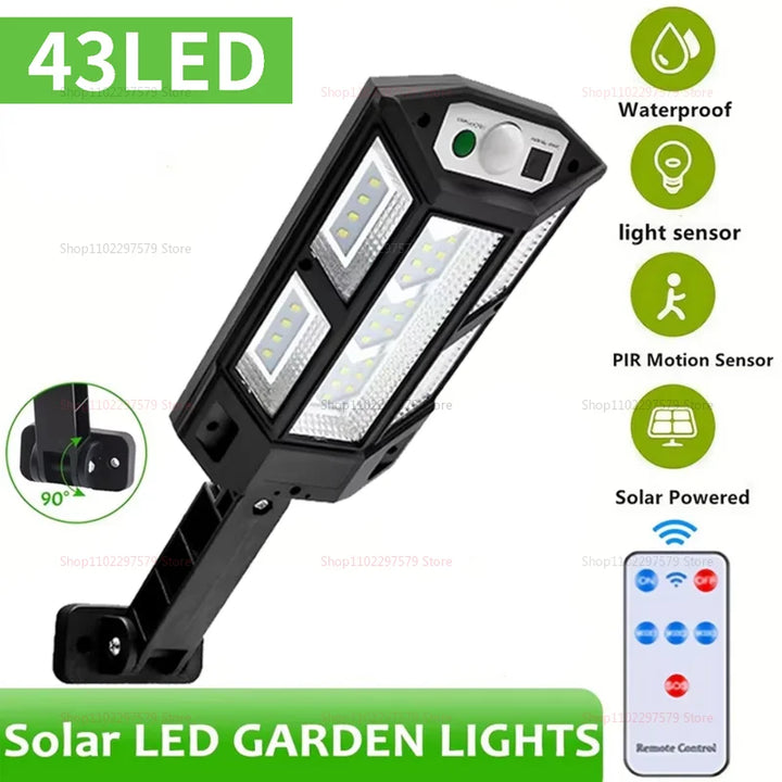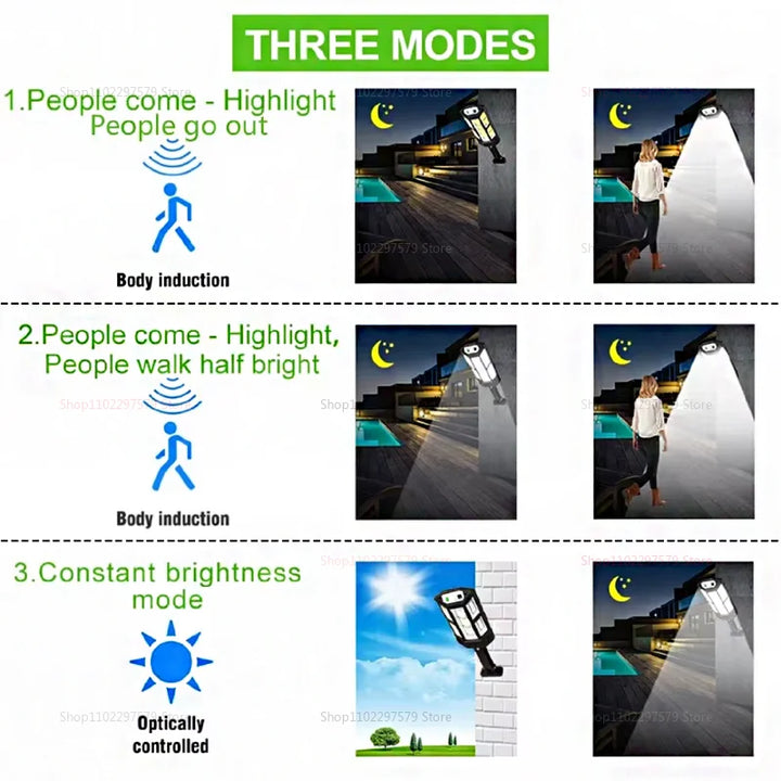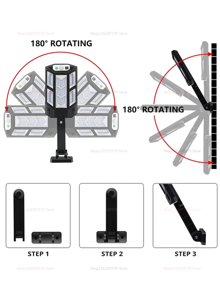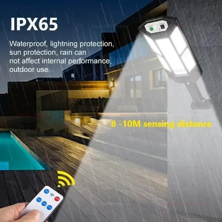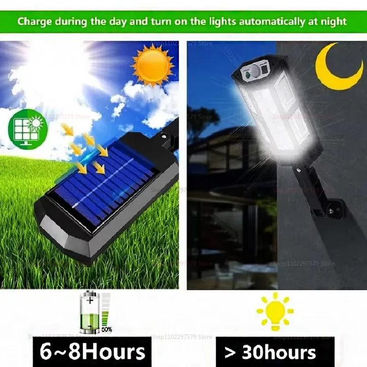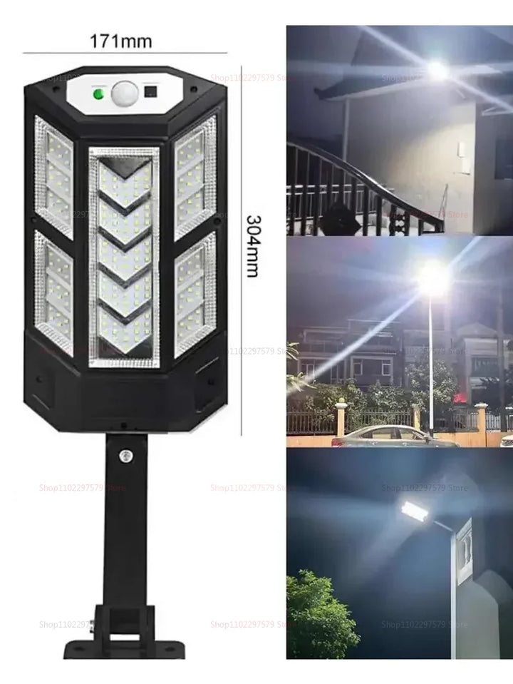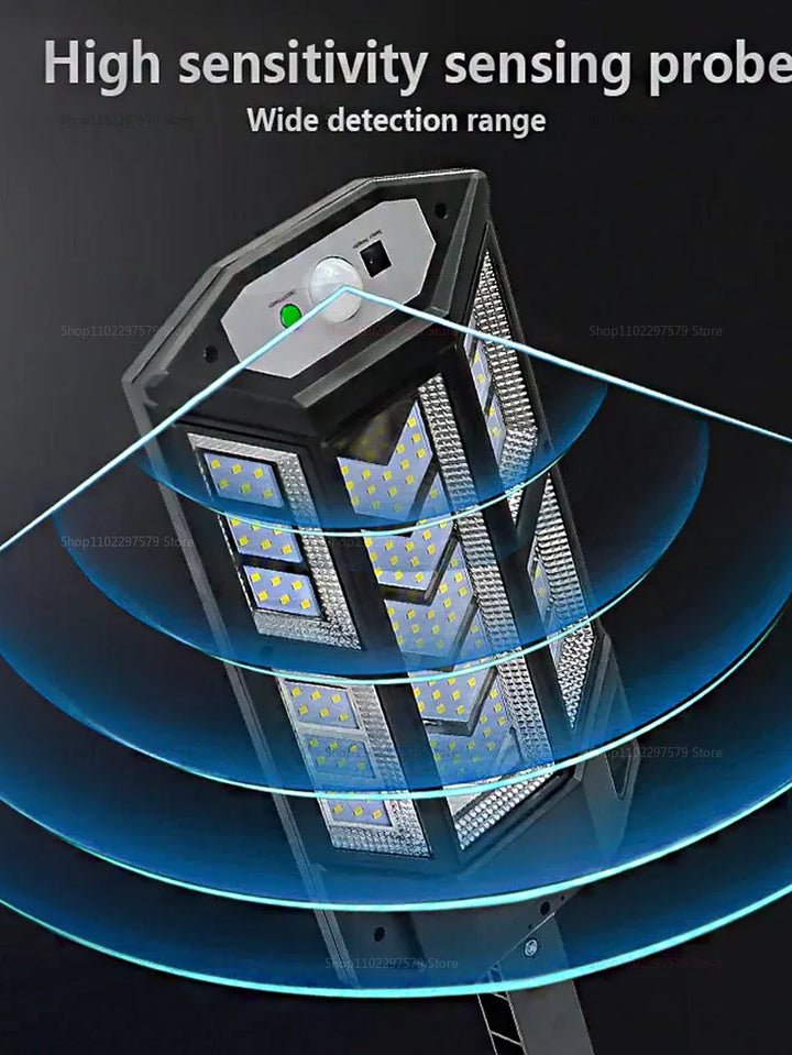 Upgrade your outdoor lighting with our advanced 9900LM solar-powered LED light, featuring a **three-sided design** and a **240-degree wide-angle illumination** — perfect for enhancing security and visibility in your yard, garden, driveway, or patio. Equipped with high-brightness LED wick technology, this solar security light delivers powerful lighting output, ensuring maximum brightness and coverage.